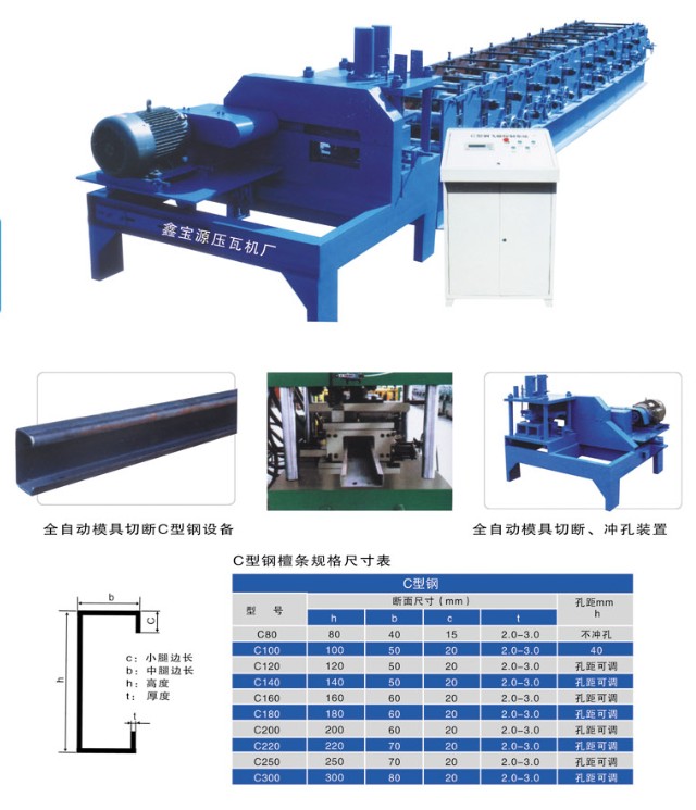 C型钢设备辊轧的C型钢成品具有的拉弯压性能平直度好,全自动定长切割,自动冲孔,自动化程度高,安装方便,产品可作为大中型工业民用建筑的主体受力结构,如厂房、仓库、机车库、飞机库、展览馆、影剧院、体育场馆、集市花棚的屋面承重荷载和墙平支撑。 C型钢飞锯冲孔,使得C型钢机操作简便。